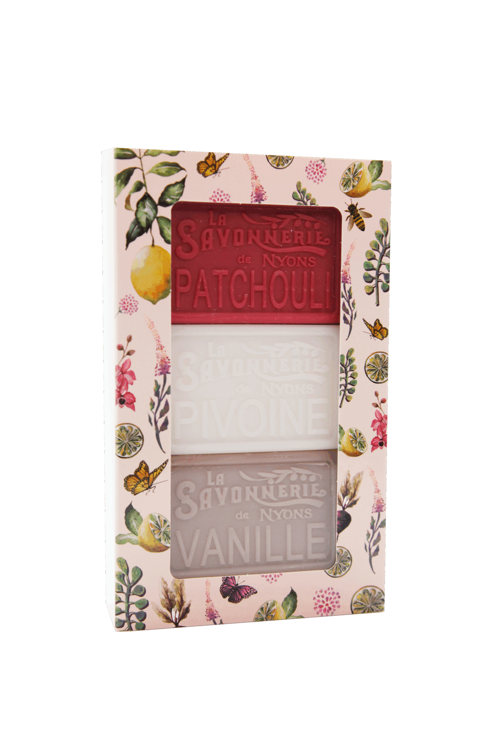 Ce fourreau Saumon contient 3 savons artisanaux de 100g aux parfums Patchouli Pivoine et Vanille. Ces savons sont enrichis en beurre de Karité BIO et à l’huile d’olive de Nyons aux propriétés adoucissantes et protectrices..Après utilisation les senteurs enhivrantes Patchouli Pivoine ou Vanille impregneront votre peau. .Vous cherchez une idée de cadeau ? Offrez ce lot de 3 savons livrés dans un joli emballage saumon à un de vos proches il en sera ravi !.Tous nos savons sont fabriqués en France au sein de notre savonnerie située à Nyons dans la Drôme Provençale – Parfums en provenance de la ville de Grasse capitale du parfum..Conseils d’utilisation.Appliquez sur peau humide. Faites mousser et rincez à l’eau abondamment. Evitez le contact avec les yeux. En cas de contact rincez abondamment les yeux à l’eau claire..Dim : 181 x 11 x 34cm