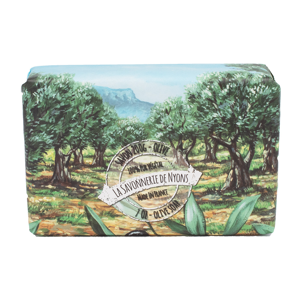 Ce savon de 200g parfum Olive est enrichi en beurre de Karité BIO et à l’Huile d’Olive de Nyons aux propriétés hydratantes et nourrissantes..Le savon est soigneusement emballé dans un papier représentant une aquarelle d’un paysage de Provence. Ce joli emballage et son savon sont parfaits pour offrir à vos proches. Faites-leur plaisir avec ce savon artisanal de 200g délicatement parfumé à la senteur olive..Savon artisanal fabriqué en France au sein de notre savonnerie située à Nyons dans la Drôme Provençale – Fragrance en provenance de la ville de Grasse capitale du parfum..Conseils d’utilisation. Appliquez sur peau humide. Faites mousser et rincez à l’eau abondamment. Evitez le contact avec les yeux. En cas de contact rincez abondamment les yeux à l’eau claire..Senteur Olive.Dim : 105 x 65 x 25cm.Livré dans son emballage papier