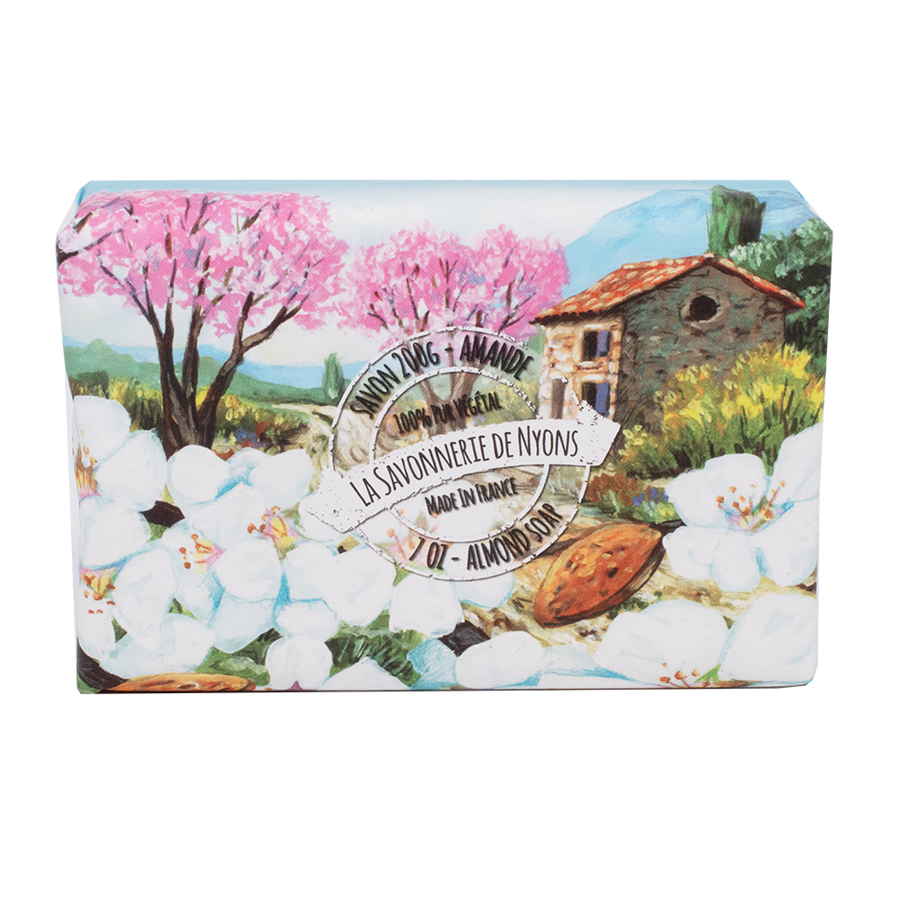 Ce savon de 200g est parfumé à la Fleur d’Amandier. Il est enrichi en beurre de Karité BIO et à l’Huile d’Olive de Nyons aux propriétés hydratantes et nourrissantes..Le savon est soigneusement emballé dans un papier représentant une aquarelle d’un paysage de Provence. Ce joli emballage et son savon sont parfaits pour offrir à vos proches. Faites-leur plaisir avec ce savon artisanal de 200g délicatement parfumé à la fleur d’amandier..Savon artisanal fabriqué en France au sein de notre savonnerie située à Nyons dans la Drôme Provençale – Fragrance en provenance de la ville de Grasse capitale du parfum..Conseils d’utilisation.Appliquez sur peau humide. Faites mousser et rincez à l’eau abondamment. Evitez le contact avec les yeux. En cas de contact rincez abondamment les yeux à l’eau claire..Senteur Fleur d’Amandier.Dim : 105 x 65 x 25cm.Livré dans son emballage papier
