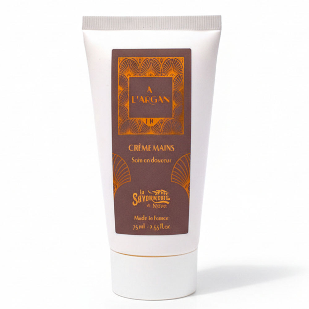 Cette Crème pour les mains contient de l’Huile d’Argan Bio aux vertues nourrissantes et réparatrices et qui redonne élasticité et souplesse à la peau et qui lutte contre les signes du vieillissement cutanné grâce à sa richesse en antioxydants. .Elle contient également du Beurre de Karité qui grâce à la présence de phytostérol aux propriétés apaisantes calme et soulage les peaux tiraillées ainsi que de l’huile de Maïs et de l’Allantoine réputée pour ses propriétés adoucissantes et apaisantes..Retrouvez la douce senteur de la gamme Argan à chaque utilisation de notre Crème pour les mains 75ml. .Pour l’emporter partout avec vous tout au long de la journée notre Crème pour les mains existe aussi au format 30ml!.Fabriquée en France – Fragrance en provenance de la ville de Grasse capitale du parfum..Conseils d’utilisation :.Utilisation quotidienne. Déposez la quantité d’une noix de crème sur la paume de votre main préalablement nettoyée et faites pénétrer par légers massages..Tube de 75 ml.14 x 55 x 32cm